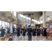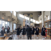 12月23日(火)12時55分から校内の玄関ホールにて、「クリスマスコンサート」を開催しました。「紅蓮華」、「ルパン3世のテーマ」、「そりすべり」を演奏しました。沢山の生徒が聴きにきてくれました。これからも皆さんに楽しんでいただける様に練習していきます。